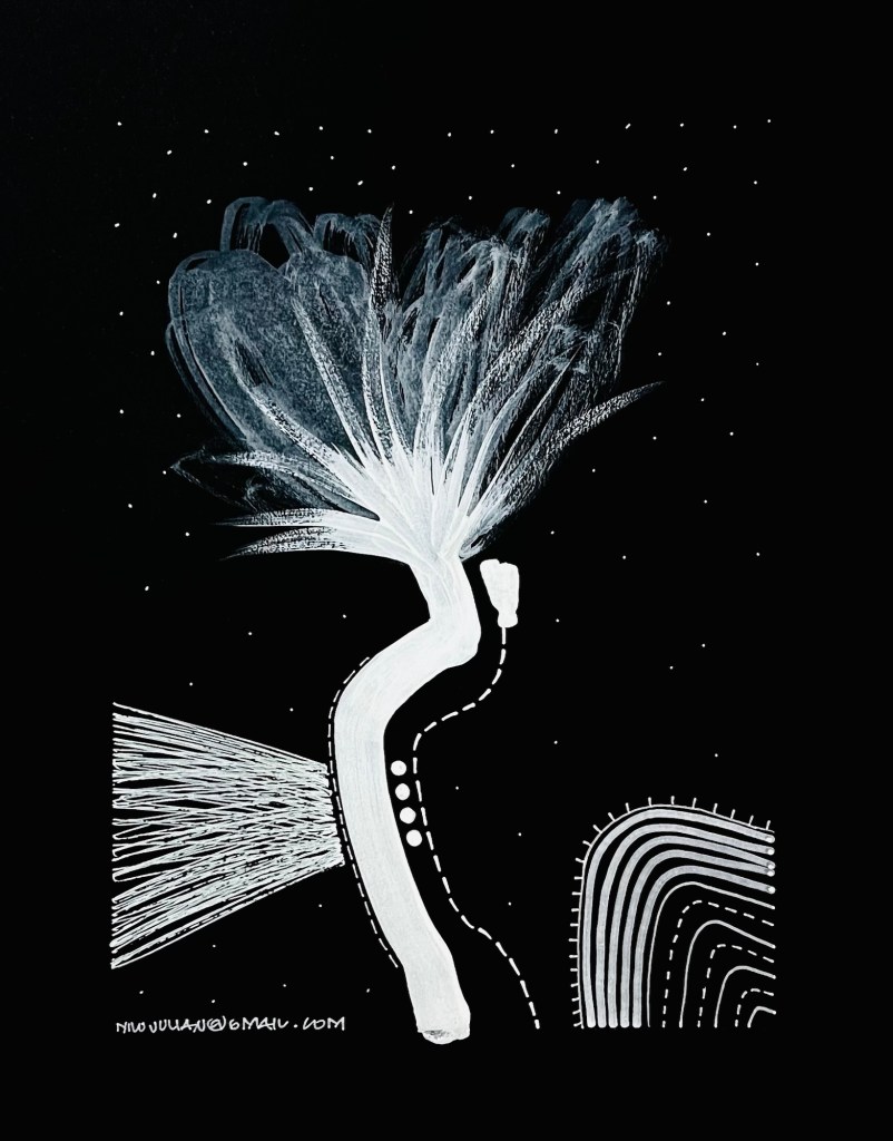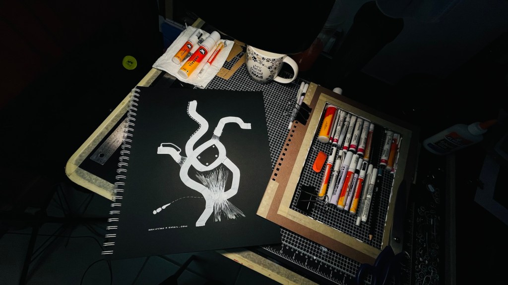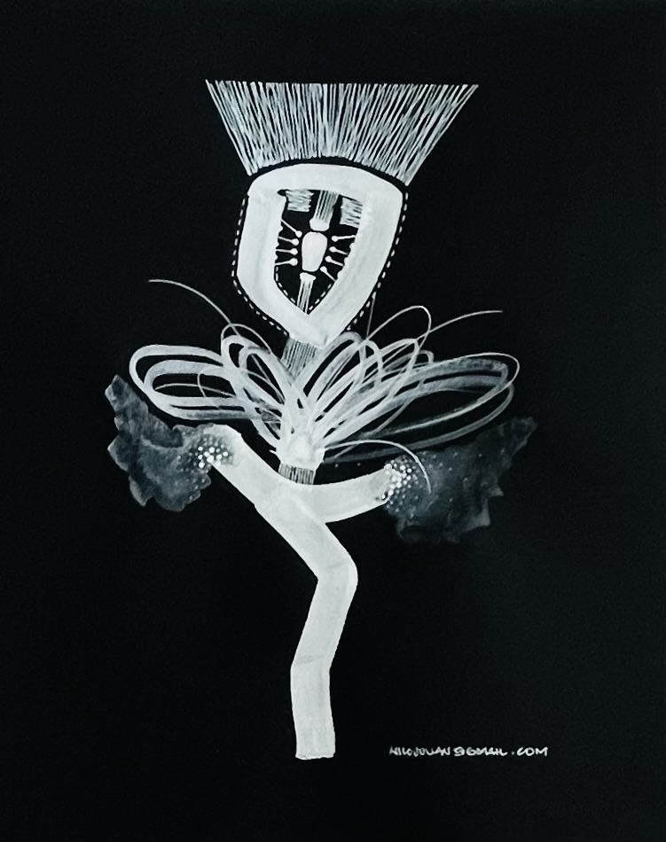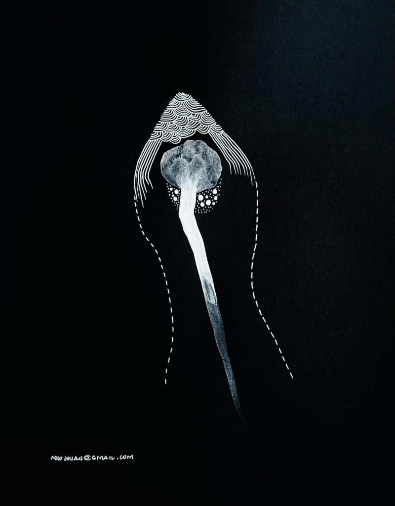 La serie se manifiesta como un ejercicio de abstracción biomórfica y diagramática que apuesta por la economía de recursos —blanco sobre negro— para enfatizar la estructura, el gesto y la energía del trazo por encima del color, permitiendo que cada línea respire como si emergiera desde una dimensión silenciosa.