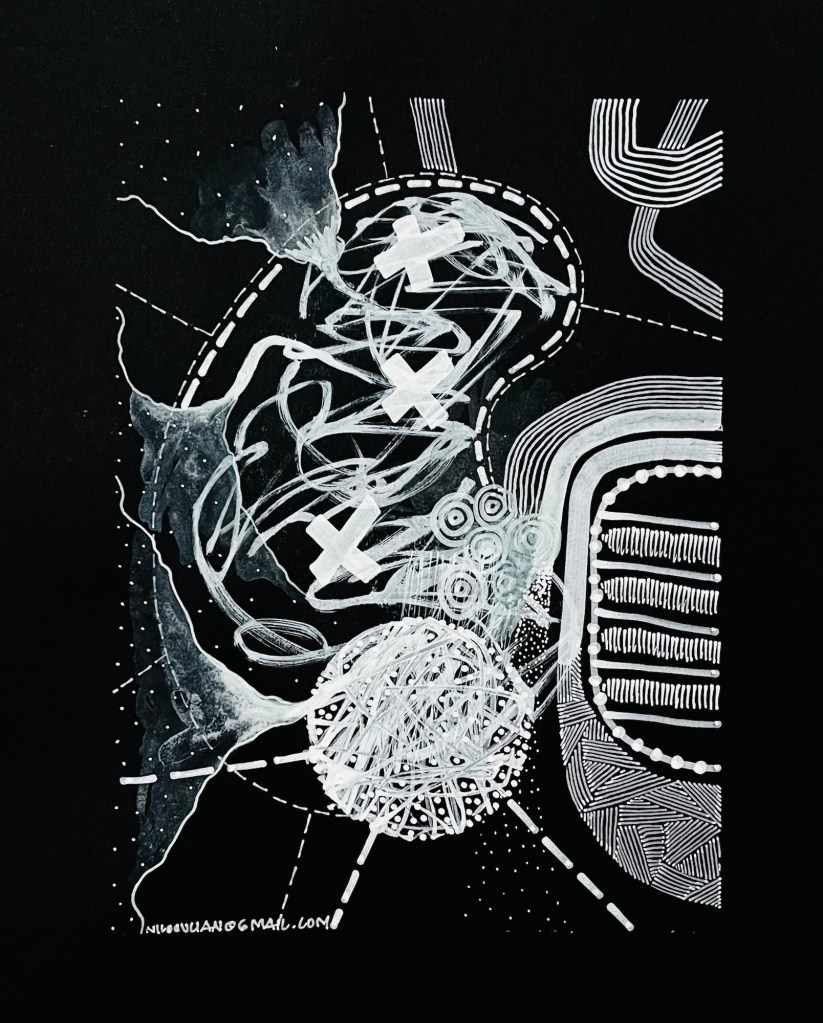 La obra se construye a partir de una tensión precisa entre gesto manual y lógica estructural. Sobre el fondo negro, las líneas blancas funcionan como sistemas de circulación que evocan simultáneamente mapas topográficos, redes neuronales y diagramas técnicos. Las zonas de tramas ondulantes generan campos de densidad visual que respiran alrededor de la forma central, mientras las líneas discontinuas sugieren trayectorias, recorridos o procesos en expansión. El contraste alto permite que cada trazo adquiera una presencia casi lumínica, como si las formas no estuvieran dibujadas sino reveladas desde el interior del soporte.