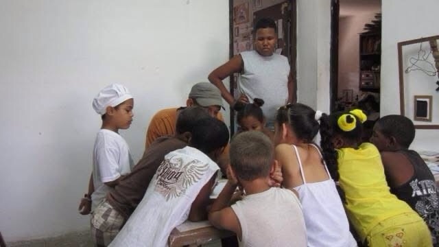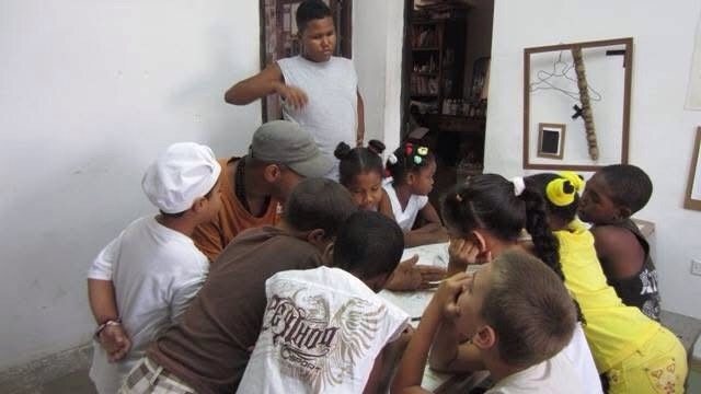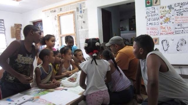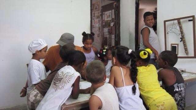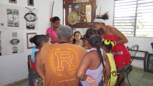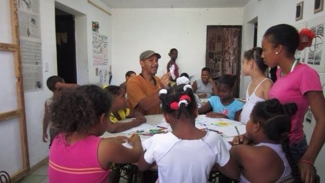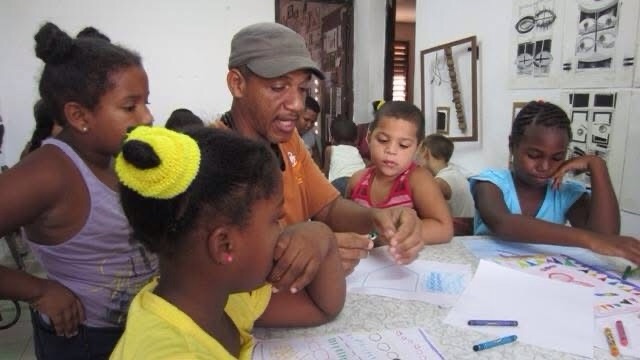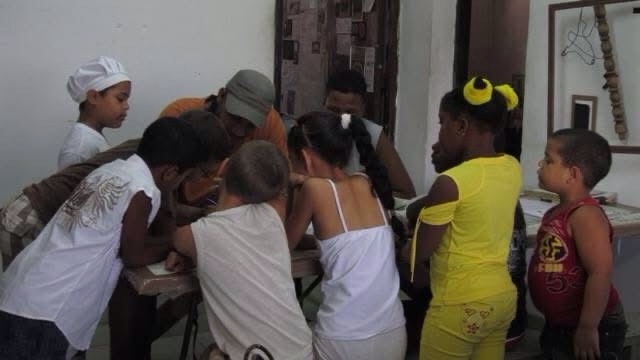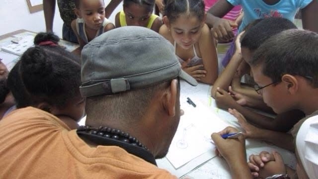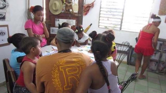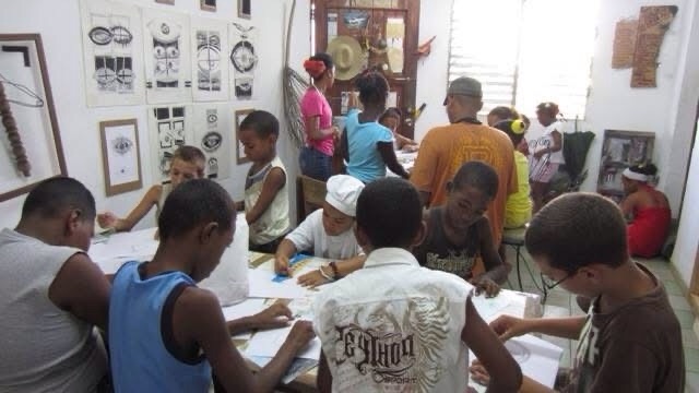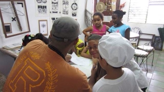 El poeta cubano Nilo Julián»The Homo Nganga» impartiendo un Taller de dibujo a los niños de su comunidad en La Casa Templo del Arte Cubano, Acetato Producciones, Alamar. Habana del Este, Cuba 2009.