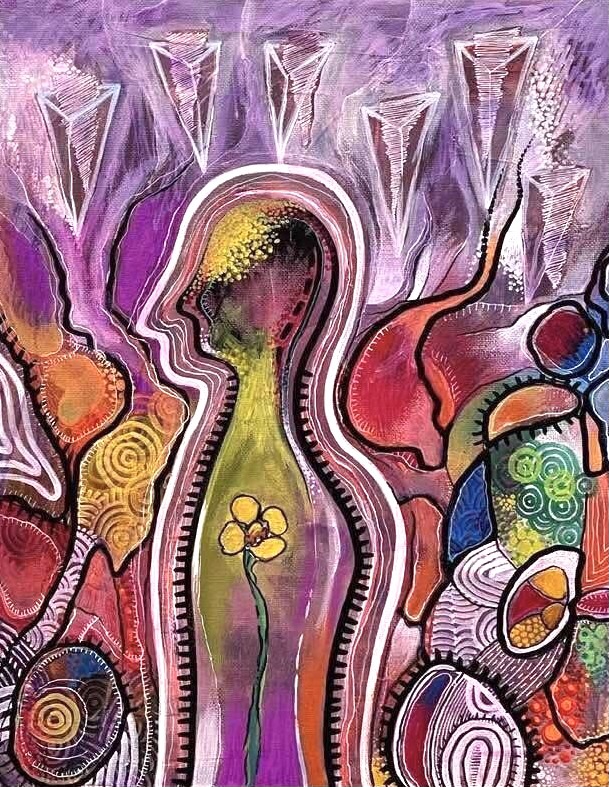 La tercera obra introduce un tono más narrativo y poético. La figura central aparece rodeada por formas que podrían leerse como espíritus, recuerdos o fragmentos del mundo natural. En el pecho florece una pequeña flor: un gesto simple, pero poderoso. Esa flor parece decir que incluso dentro del cuerpo más vulnerable existe una semilla de luz. Las flechas sobre la cabeza indican dirección, ascenso, movimiento espiritual. La obra respira como un poema visual donde el ser humano se convierte en puente entre materia y misterio.